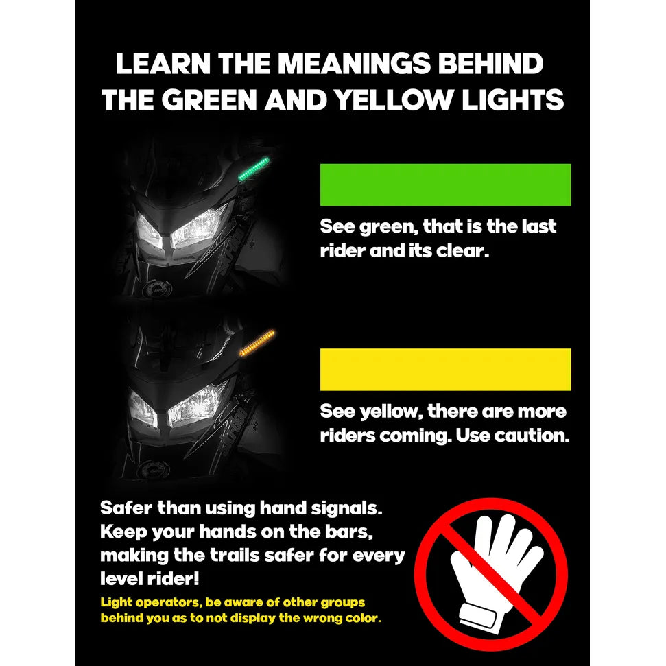 - Green indicates the operator is alone or the last rider in their group. Amber indicates that the operator is the lead rider and/or that there are one or more riders behind them.
